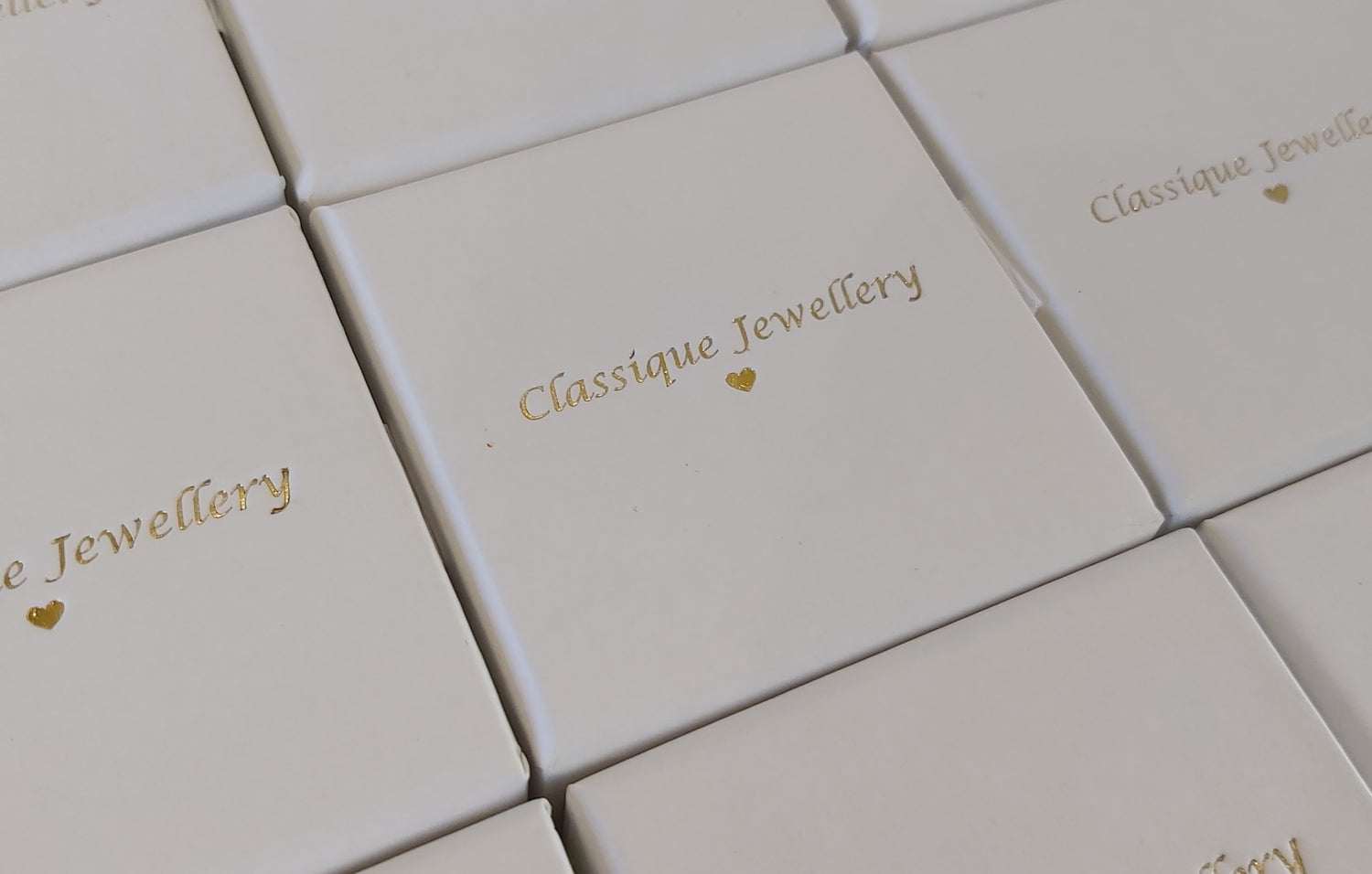 Each piece is packaged in our beautiful drawer style white boxes with a gold filled logo.